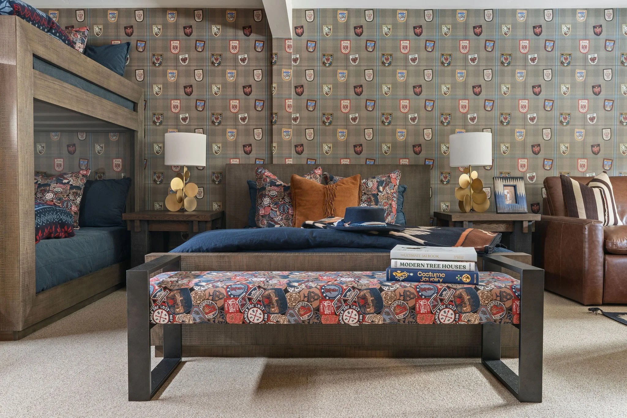 Full-size bunks and a queen bed wrapped in Nordic ski blankets against vintage Swiss lodge badge wallpaper — plus its own leather couch, TV, en suite bath, and a steamer trunk full of games, so the kids never want to leave (and you don't need them to).