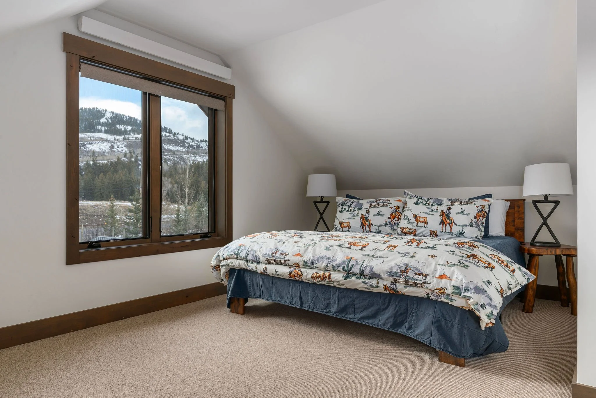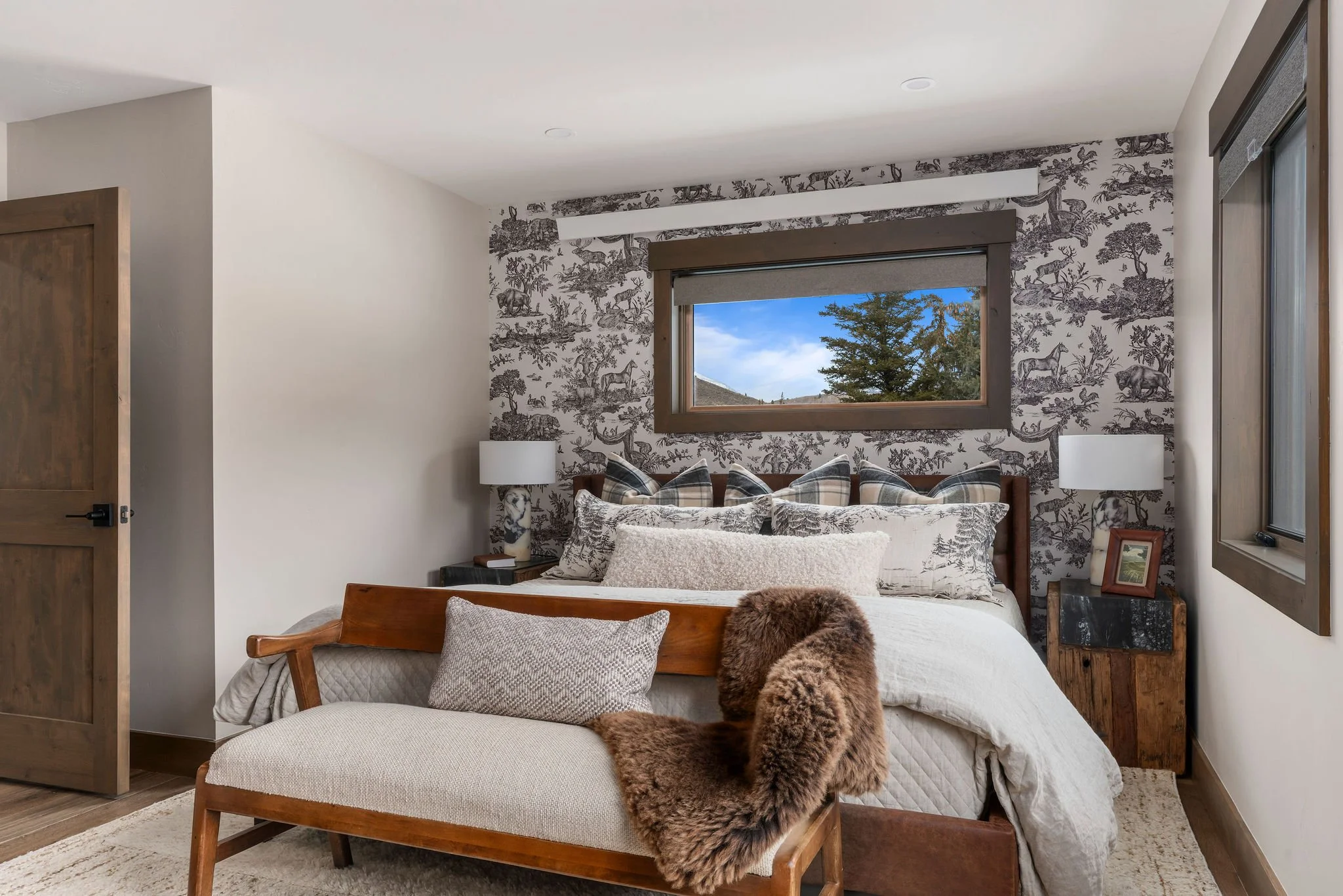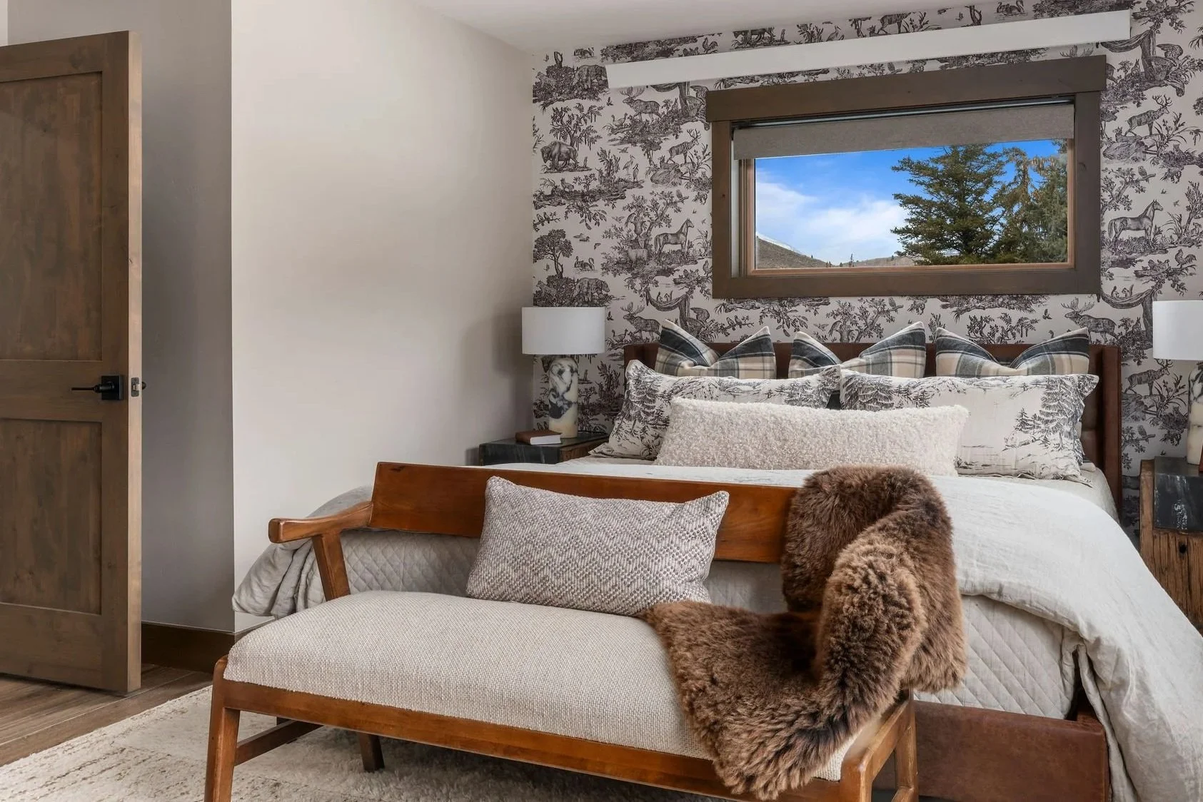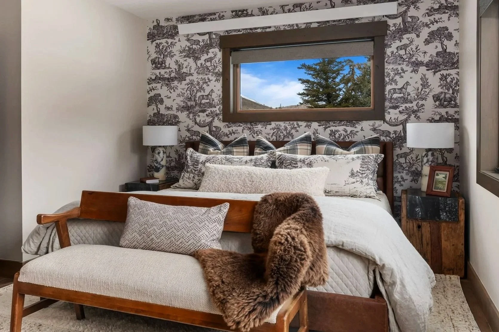 A king bed dressed in Pendleton-style pillows and sheepskin beneath vintage ski wallpaper, with a bison portrait keeping watch and snow-covered hills framed in the window beside you.