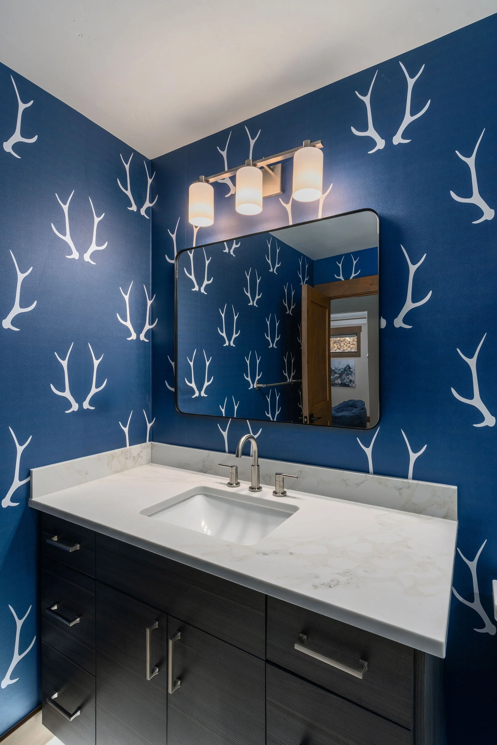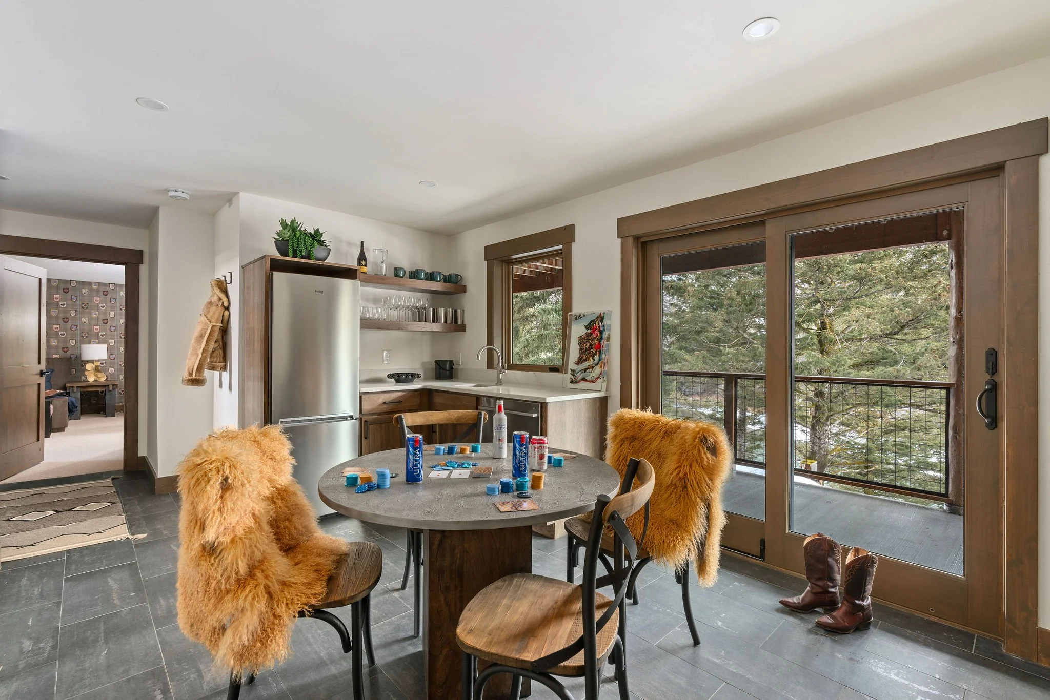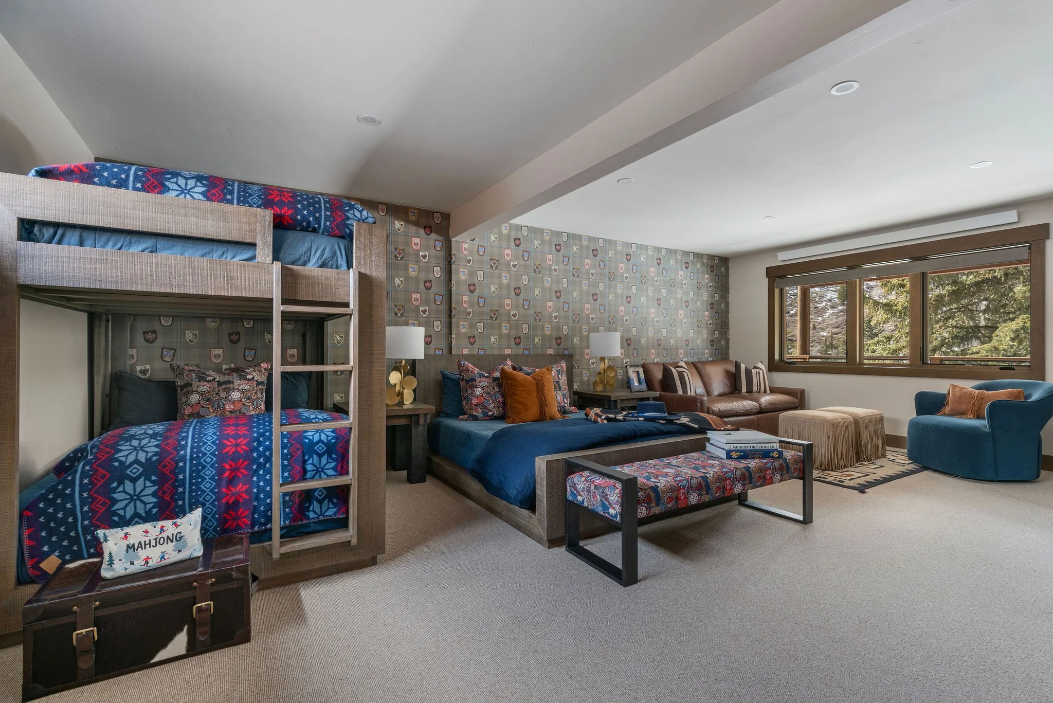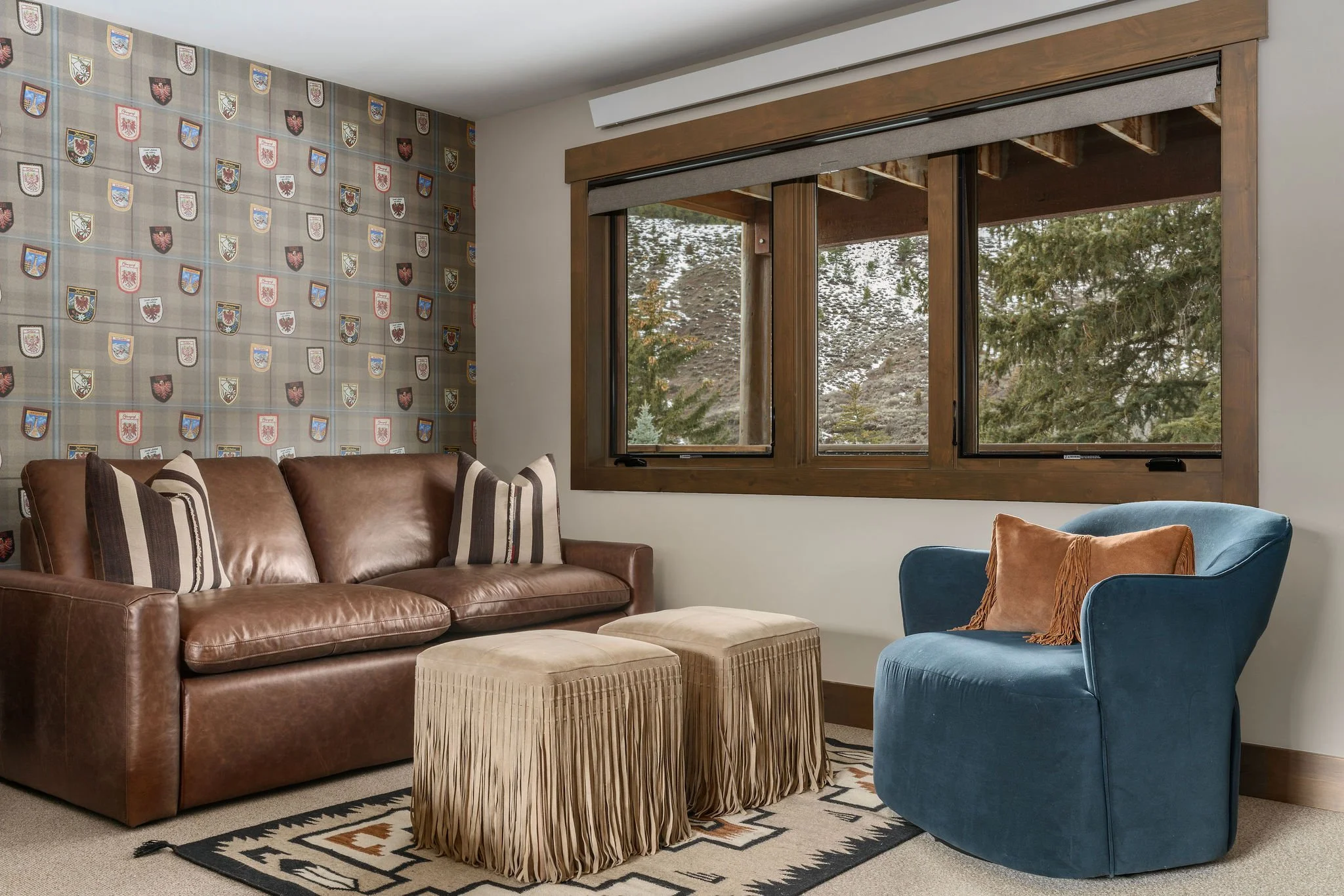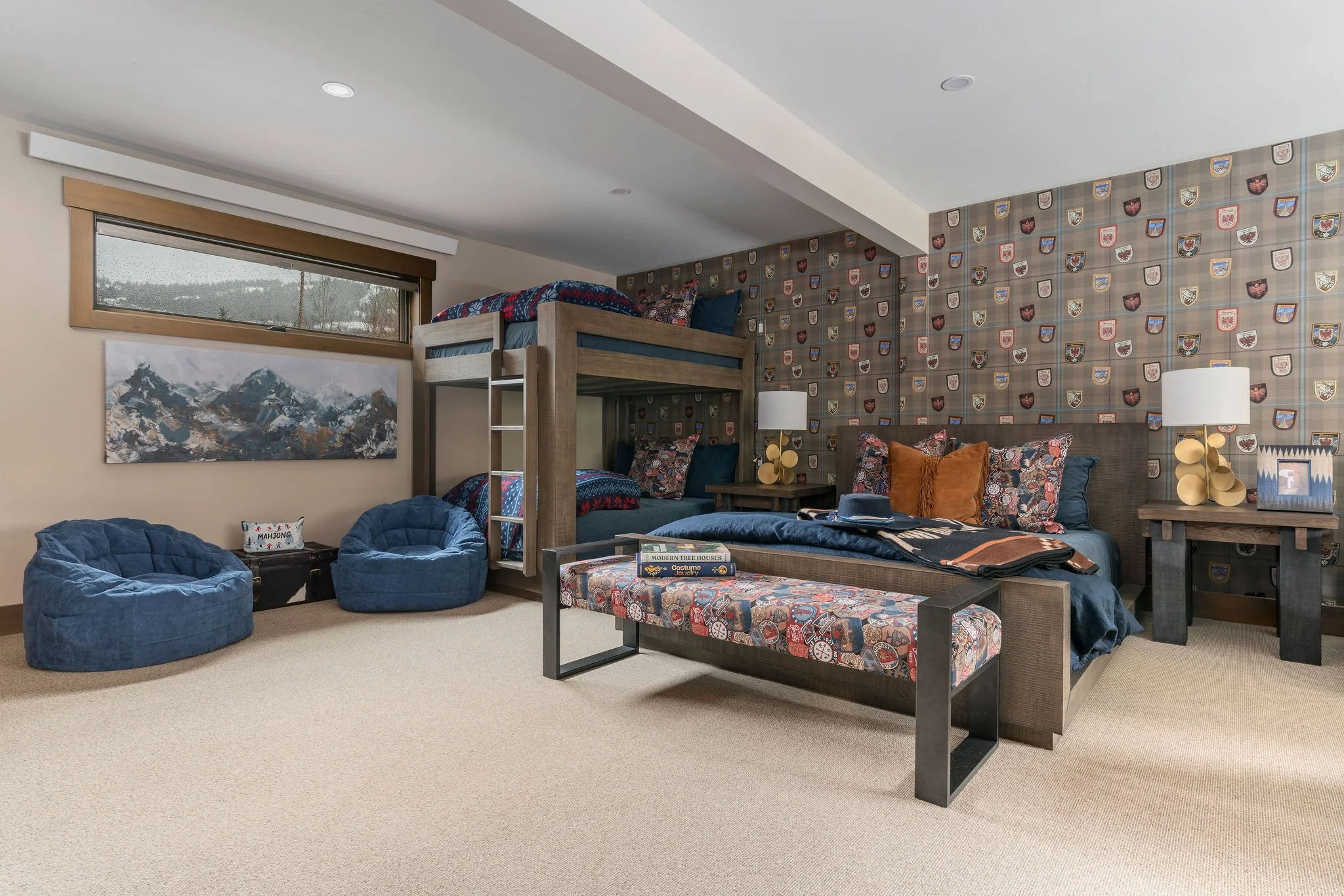 The Bunk Room is where kids claim territory and never give it back. Full-size bunk beds dressed in bold Nordic ski blankets sit beside a queen bed, all against a wallpaper of vintage Swiss ski lodge badges in muted blues and grays — the kind of pattern that makes the whole room feel like a European alpine club. A leather sofa, three upholstered chairs, a wall-mounted TV, with a bevy of games to keep fun going even on quiet nights inside with a timber-framed window that looks out over the Snake River valley.