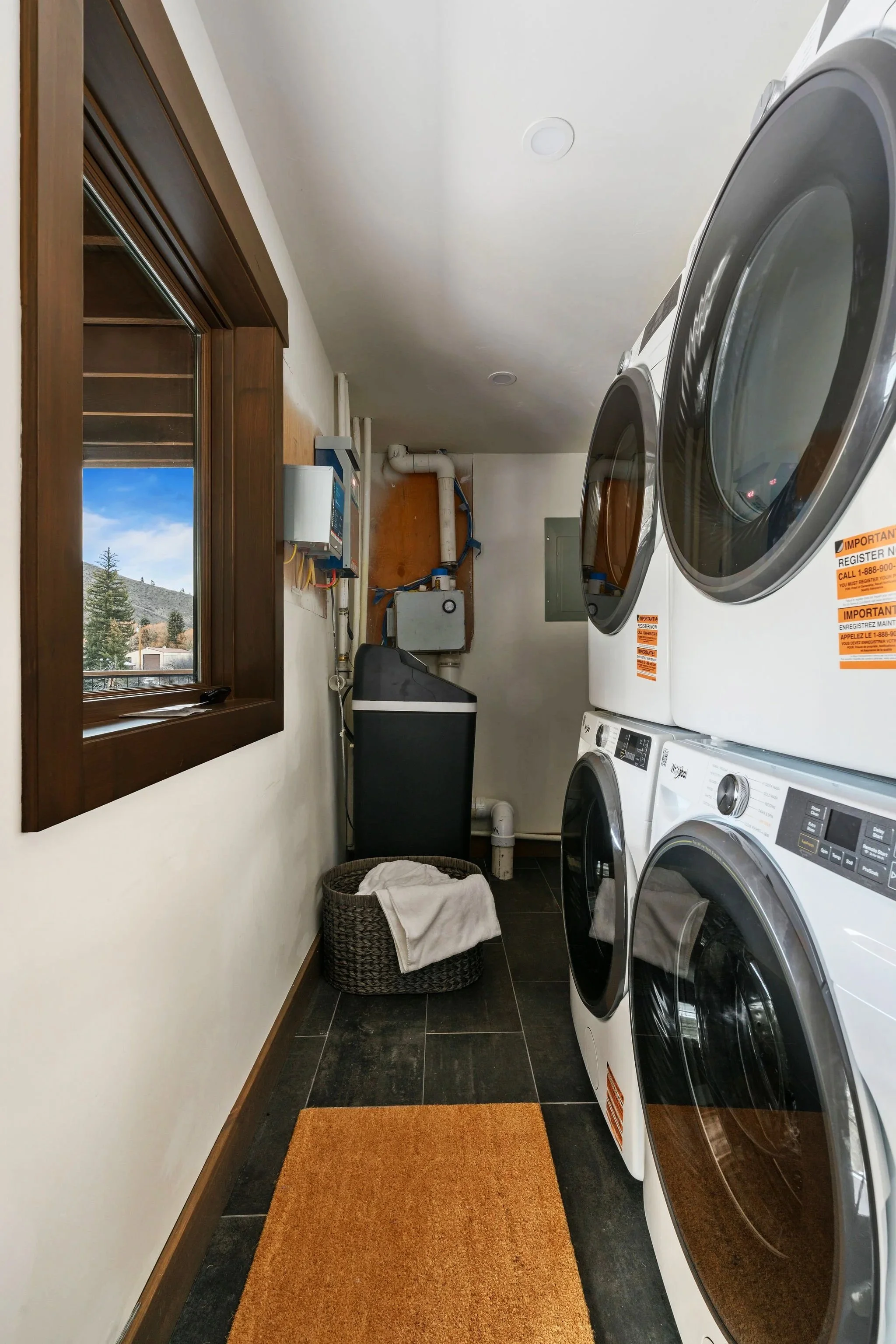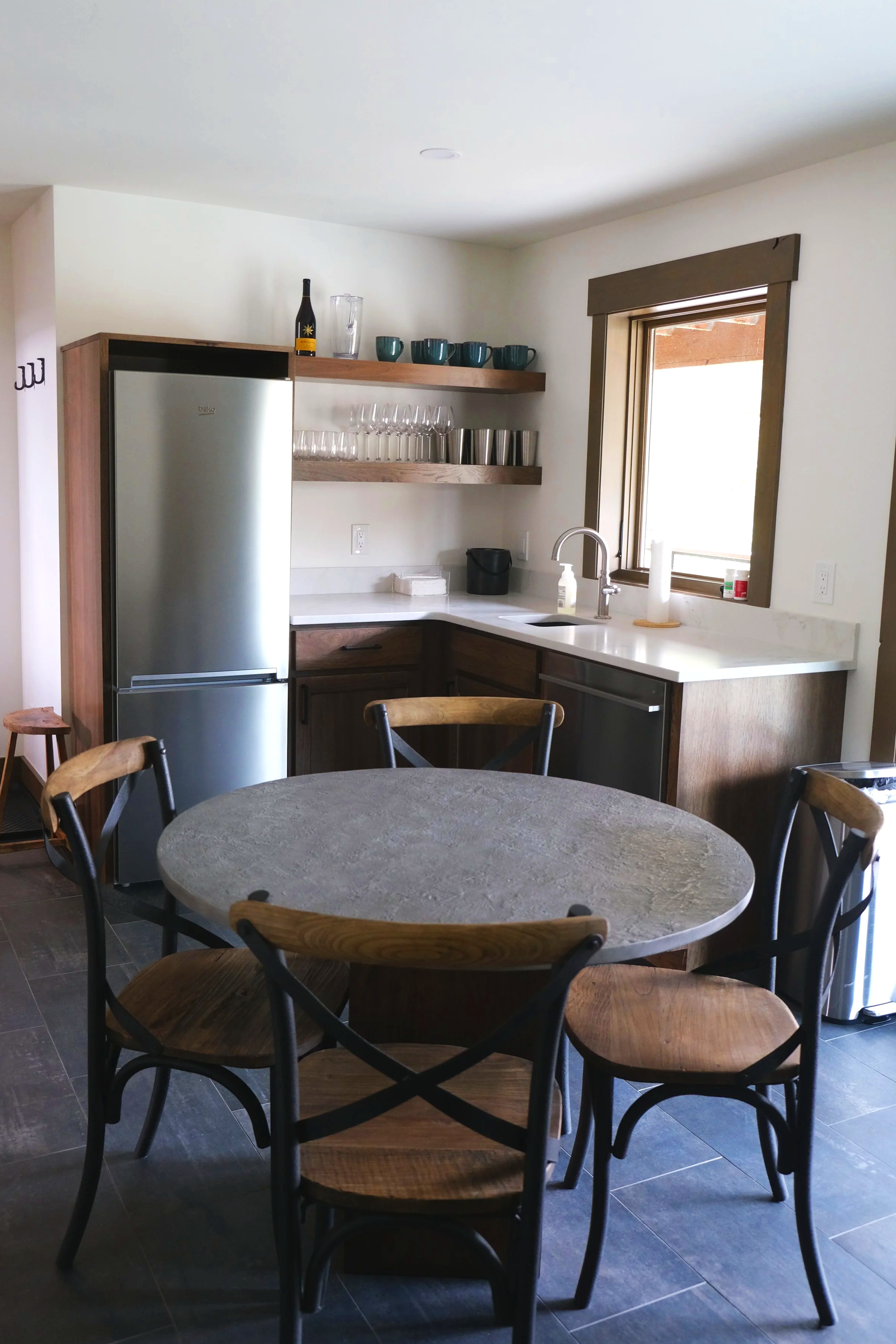The lower level of Howell River House operates as its own self-contained wing, and the kitchenette is where that independence becomes real. A corner galley with walnut cabinetry, quartz countertops, a stainless steel refrigerator, and open floating shelves lined with wine glasses, ceramic mugs, and a bottle waiting to be opened sits beside a timber-framed window with a colorful ski painting propped against the sill. A round stone-top dining table with four cross-back chairs — two of them draped in golden Mongolian sheepskin throws — faces full-height sliding glass doors that open onto the deck and the evergreens beyond. Cowboy boots by the door, a fur-trimmed vest on the wall hook, a card game mid-hand on the table: this is the room that feels the most lived-in, the most like the house has already been enjoying itself before you arrived. Just off the kitchenette, a dedicated laundry room houses a full-size stacked washer and dryer — a detail that matters more than you'd think on a three-month seasonal stay, and one that most luxury rentals in this market quietly omit.