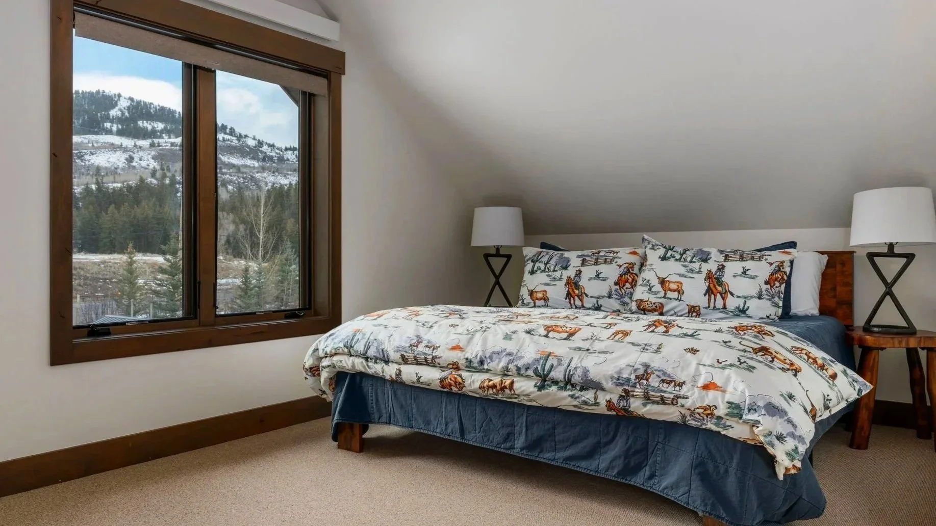 The top floor of Howell River House belongs to The Overlook Room — a full private suite tucked beneath the pitched roofline that feels like its own world. The bedroom sits under a sloped ceiling, with a king bed dressed in hand-illustrated Western ranch linens depicting cowboys, cattle, and open-range scenes, flanked by rustic cross-base lamps on live-edge nightstands. A timber-framed window beside the bed opens to the snow-dusted hills and evergreens of the Snake River corridor. Step through and the room opens into a generous living area with two upholstered armchairs, a cushioned window seat with valley views, a bamboo game table for four, a mid-century walnut credenza, and a large wall-mounted TV — more than enough space to settle in for an evening after a long day on the mountain or the river. The dormer windows on both sides fill the room with natural light and frame the landscape from multiple angles. There's no en-suite bathroom on this level, but what it lacks in plumbing it makes up for in privacy — this is the room couples fight over, and the room teenagers disappear into for the entire trip.