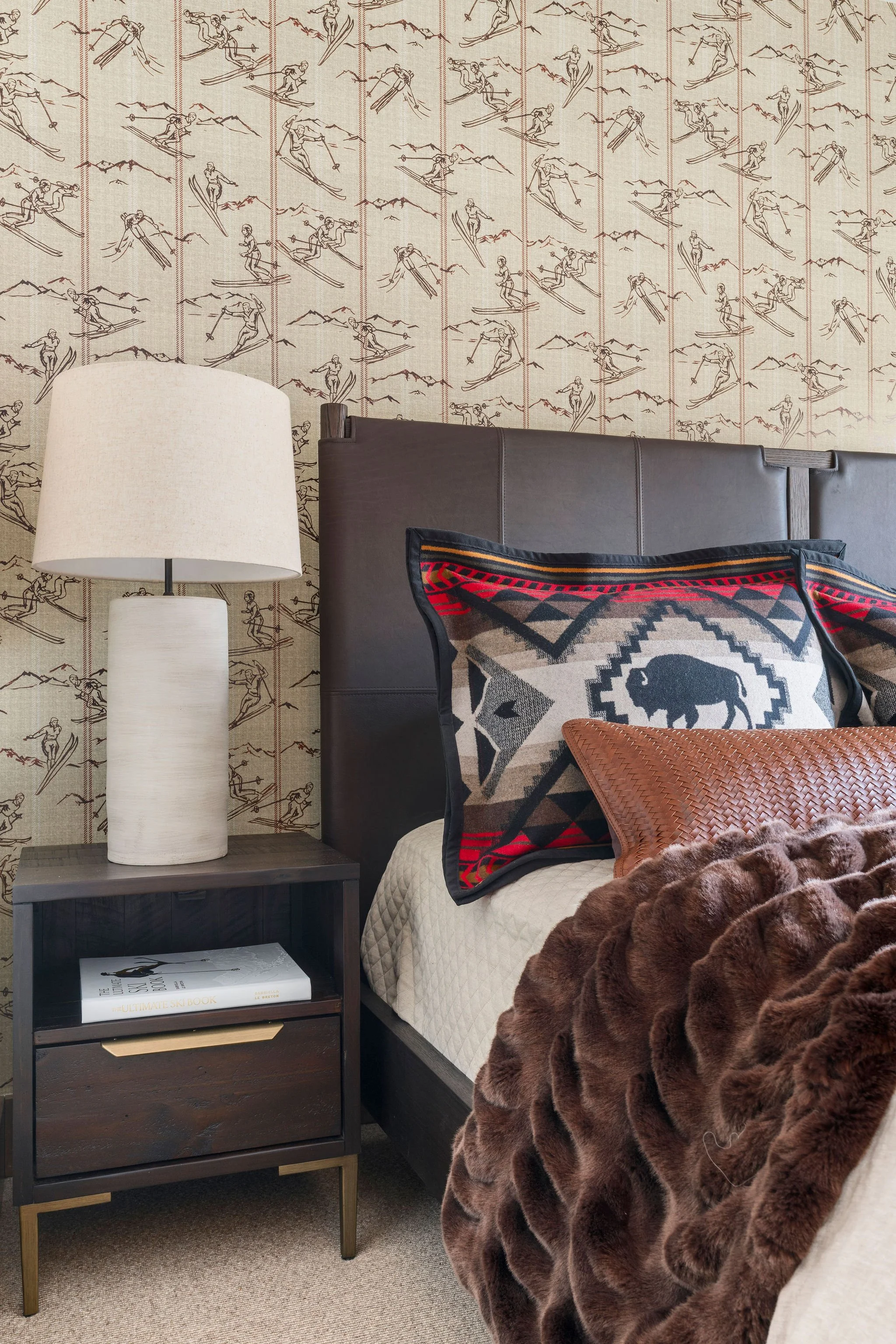 The Ski Run Room is one half of a jack-and-jill suite that shares a beautifully appointed bathroom with the Fly Fishing Room next door. A king bed sits beneath a leather upholstered headboard stacked with Pendleton-style pillows in red, black, and bison motifs. But the room's real conversation piece is the wallpaper — a vintage-style illustrated pattern of hand-drawn skiers in every imaginable position, carved turns and tuck jumps repeated across a warm linen background, as if someone sketched an entire day at Jackson Hole Mountain Resort and turned it into art. A large-scale black-and-white bison portrait hangs opposite, and the timber-framed window beside the bed puts the snow-covered hills of the Snake River valley right where they belong — close enough to remind you why you came.